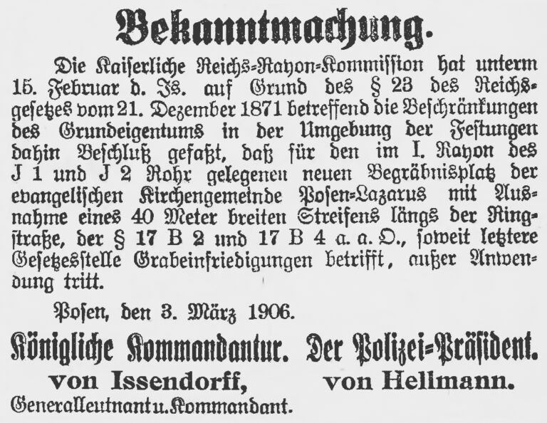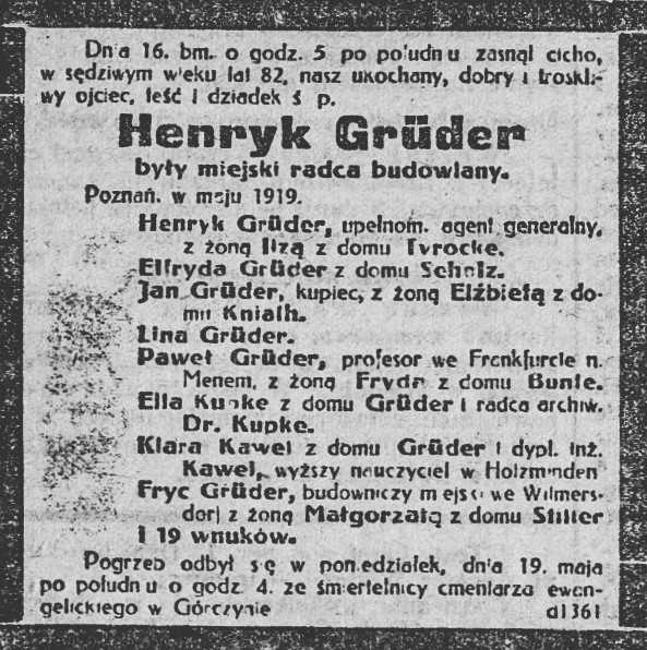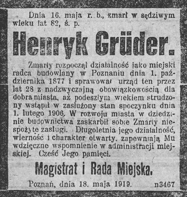 Na cmentarzu parafii Chrystusa w 1919 r. pochowano miejskiego radcę budowlanego, Heinricha Grüdera, autora wielu zrealizowanych projektów architektonicznych, w tym tak znaczących dla Poznania, jak: Nowy Ratusz, Poliklinika Prowincjonalnego Zakładu dla Akuszerek przy ul. Polnej czy budynki szkolne przy ul. Słowackiego oraz przy ul. Działyńskich. Nade wszystko, był Grüder autorem koncepcji zupełnego zniesienia zachodnich umocnień poligonalnych twierdzy poznańskiej. Swoje projekty, uwzględniające wyburzenie fortyfikacji oraz likwidację śródmiejskich cmentarzy i urządzenie rozległych promenad oraz obwodnic w miejscu nekropolii, bram i bastionów, rozwijał w latach 90. XIX w. Ostatecznie koncepcję przebudowy według Grüdera uznano za nieekonomiczną oraz nie spełniającą oczekiwań na miarę „wielkomiejskiego Poznania” – stolicy Marchii Wschodniej. U progu XX w. przystąpiono do realizacji planów tzw. ringu Josepha Stübbena…
