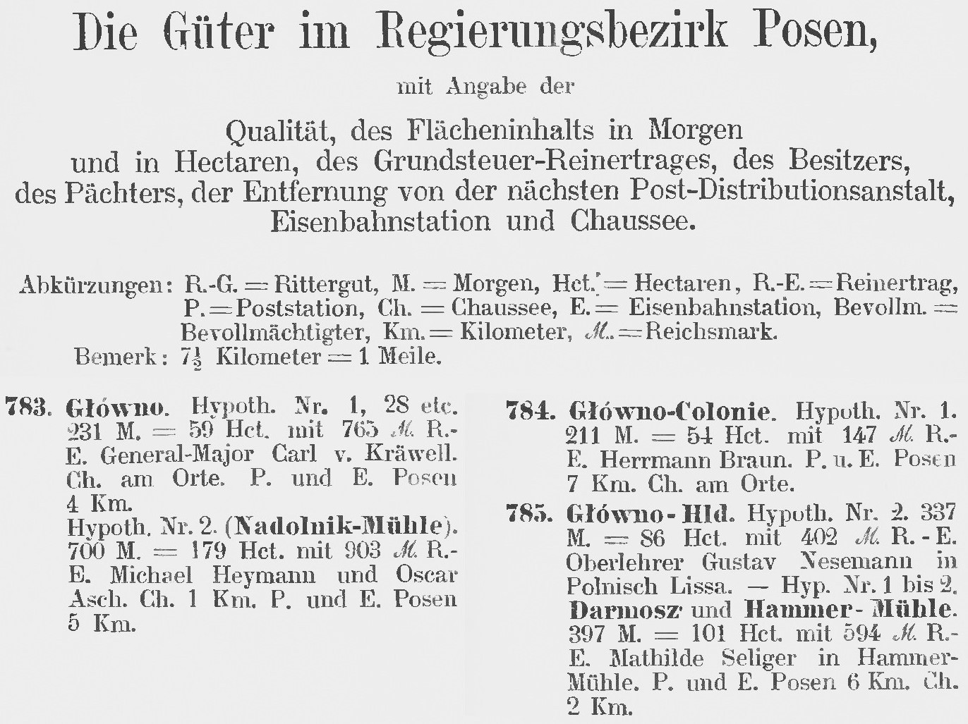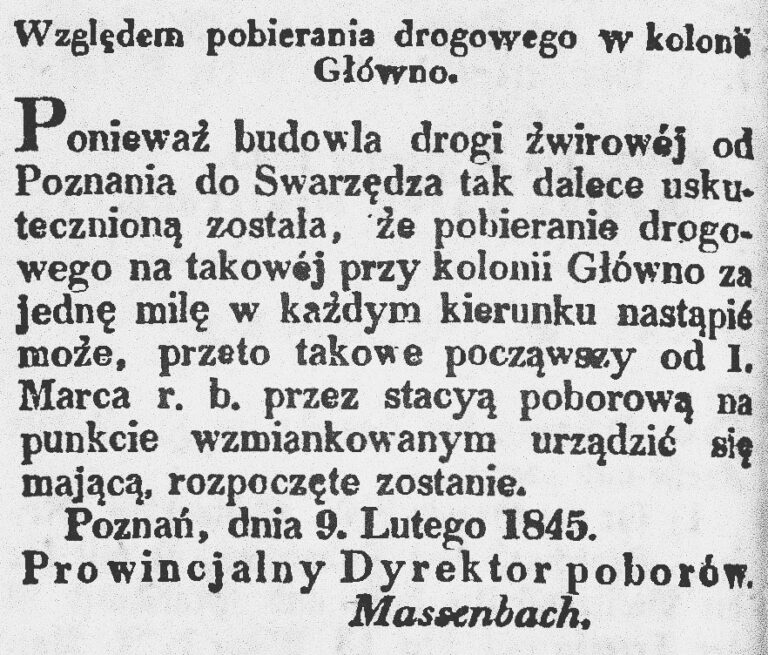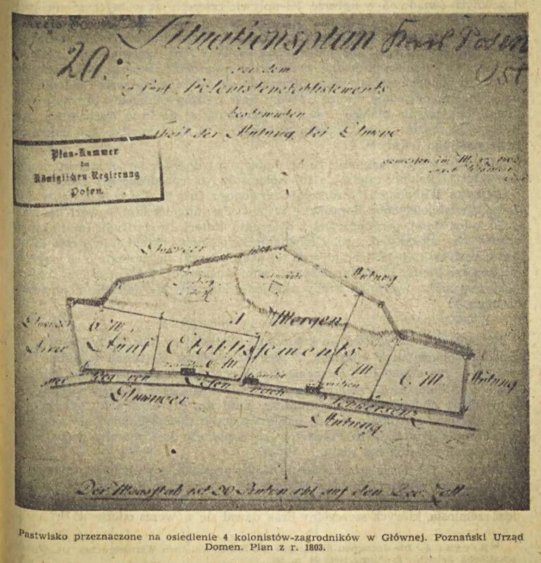 Na podstawie dziewiętnastowiecznych map, planów i szkiców stwierdzić można, iż od zabudowań kolonii (na które składało się kilka domów oraz niewielki cmentarz, niekiedy na niemieckich mapach topograficznych oznaczany jako „khf” – skrót od Kirchhof) biegła droga do leśnictwa („F. Streitort”), którego zespół budynków znajdował się na skraju lasu. Między drogą na Warszawę a obecną ul. Gnieźnieńską Prusacy założyli Lasy Królewskie (tzn. państwowe), poprzecinane regularnie wytyczonymi, istniejącymi również współcześnie, ścieżkami. Po II wojnie światowej wywożono tu (na „nieużytki w Głównej”) i detonowano niewybuchy, pozyskane w czasie działań saperskich na terenie Poznania i okolic. Akcję rozminowywania miasta opisywał jej zasłużony uczestnik, saper-amator, kapral Edmund Kolasiński.