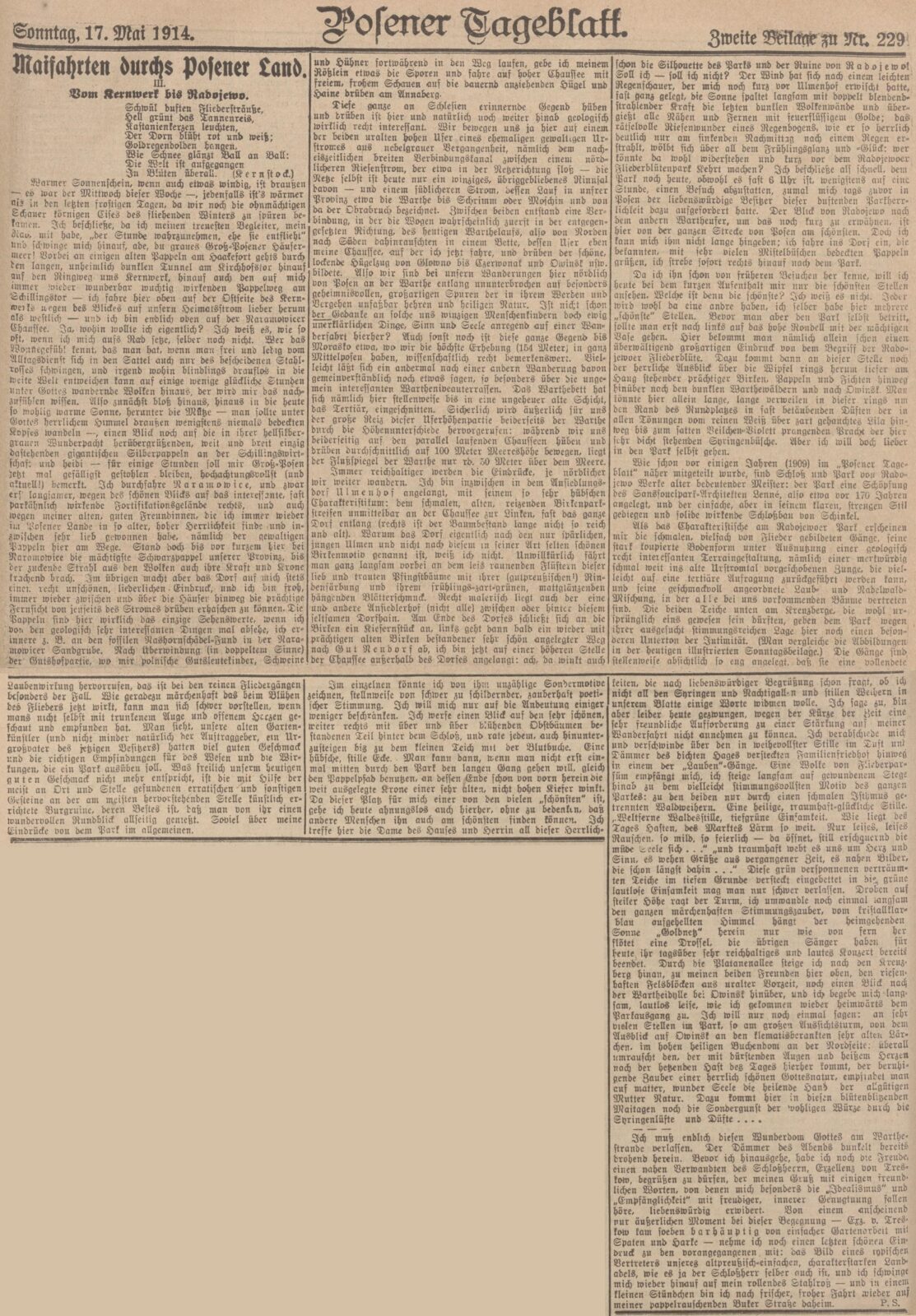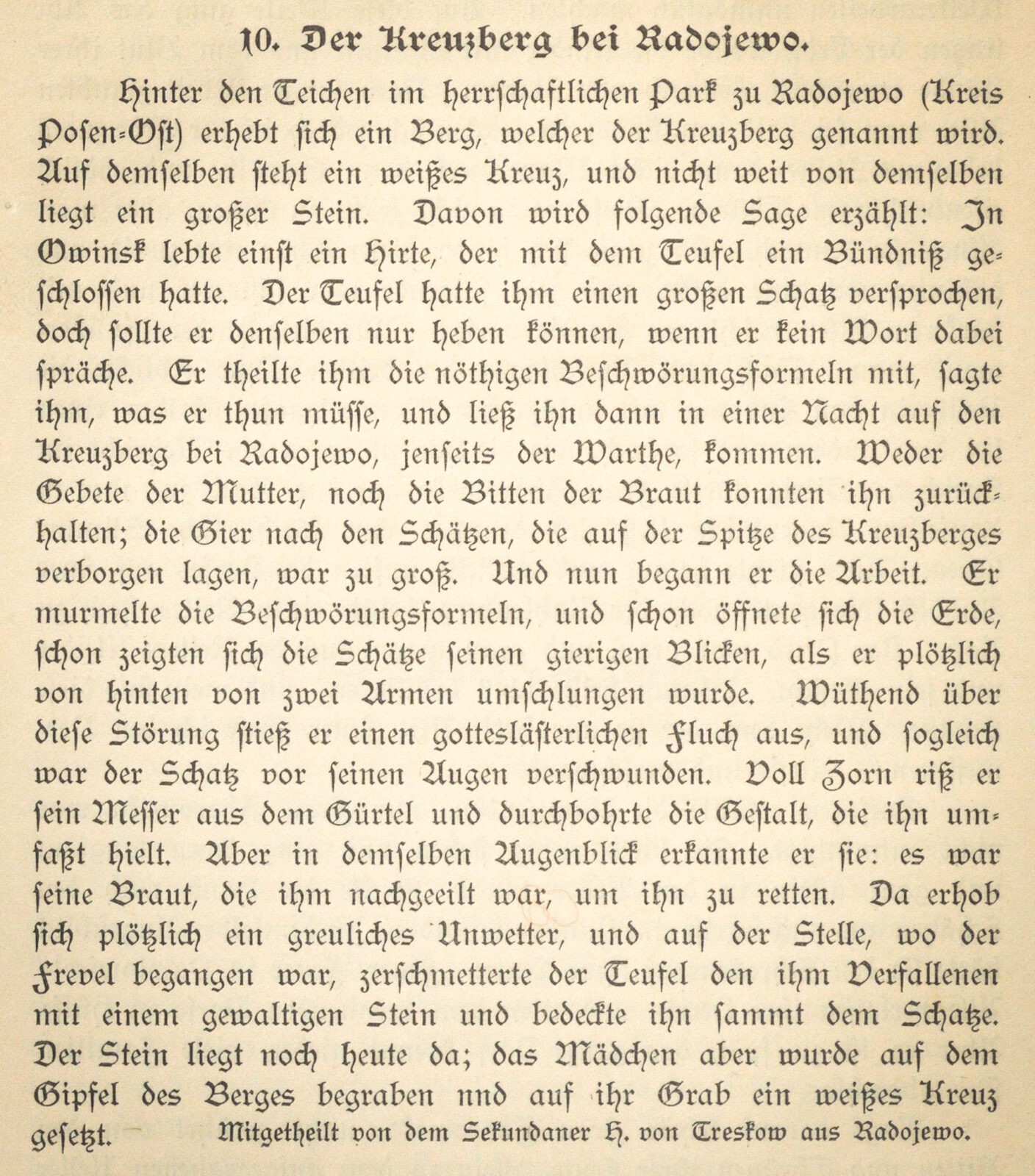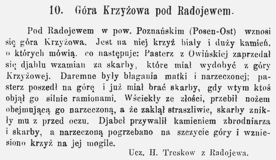 W tym tygodniu odbył się pogrzeb majora w st.[anie] sp.[oczynku] von Büntinga. Ten starszy pan był pradziadkiem licznych i szacownych wnuków, dzieci i prawnuków. Znało go prawie całe miasto. Jego córka, żona właściciela ziemskiego von Treskow, do którego należy majątek Radojewo, poleciła na tamtejszym rodzinnym cmentarzu przygotować dla niego piękny nagrobek. Zanim trumna opuściła miasto, w mieszkaniu von Treskowów, które znajduje się tutaj w Poznaniu, odbyło się czuwanie przy zmarłym. Także pastorowie pojechali do Radojewa, by pobłogosławić zmarłego i wygłosić kilka słów otuchy.