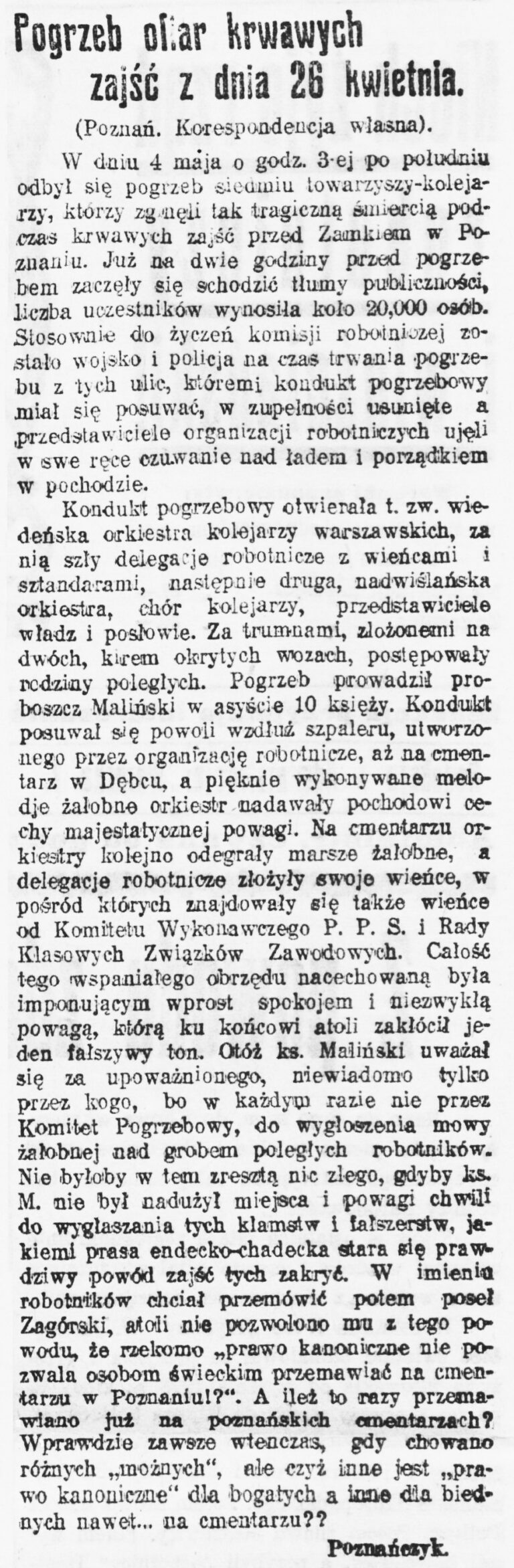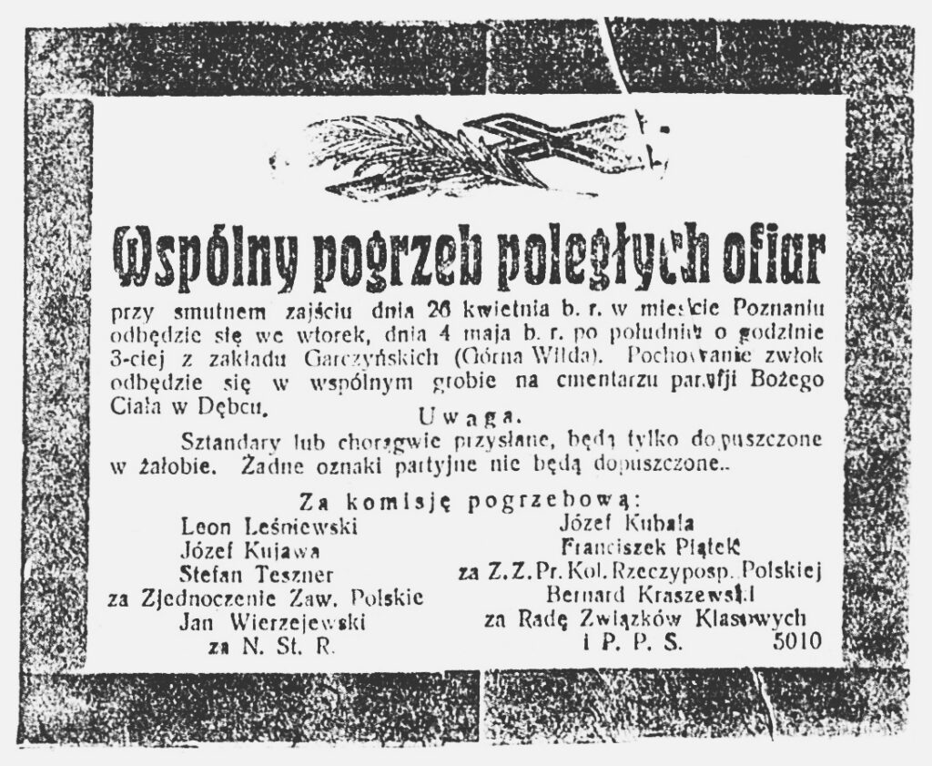 Związkowcy utworzyli komitet****, który zajął się organizacją pogrzebu zastrzelonych kolejarzy. Ceremonia pogrzebowa przerodziła się w manifestację, w której udział wzięło 20 tysięcy żałobników, niezliczone poczty sztandarowe i orkiestry, była ona jednakowoż ostatnim przejawem jedności środowisk robotniczych w Poznaniu. Minęła żałoba, a wraz z nią „klasowa solidarność”; wróciły za to polityczne spory związkowców o wpływy w administracji odradzającego się i jednoczącego po okresie zaborów państwa polskiego.