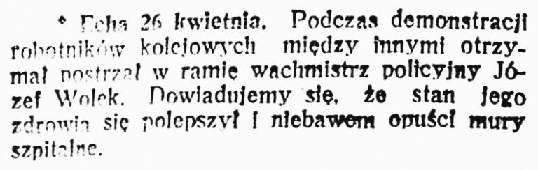 „Siedmiu robotników poległo na miejscu, dwóch zmarło z odniesionych ran, ponad trzydziestu zostało ciężko rannych. Spośród zabitych na miejscu robotników, dwóch straciło życie (…) wskutek pobicia kolbami. Spośród siedmiu zastrzelonych, sześciu trafionych zostało w plecy” – pisał prof. Antoni Czubiński, zapominając dodać, iż rozruchy trwały jeszcze nocą, przeniosły się na pl. Świętokrzyski (ob. plac Wiosny Ludów) i Półwiejską, gdzie uwolnieni przez rozjuszonych robotników więźniowie z Fortu Grolman* zastrzelili szeregowca Jana Grabeckiego** z Wojskowego Więzienia Śledczego i ranili kilku innych mundurowych***. Tłum urządził też olbrzymią manifestację, obnosząc po mieście ciało jednego z zabitych wcześniej kolejarzy. Do śródmieścia wkroczyło wojsko, które przywróciło porządek; wprowadzono godzinę policyjną oraz prewencyjną cenzurę prasy.