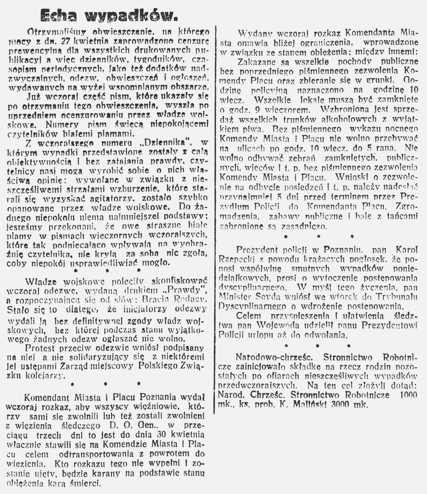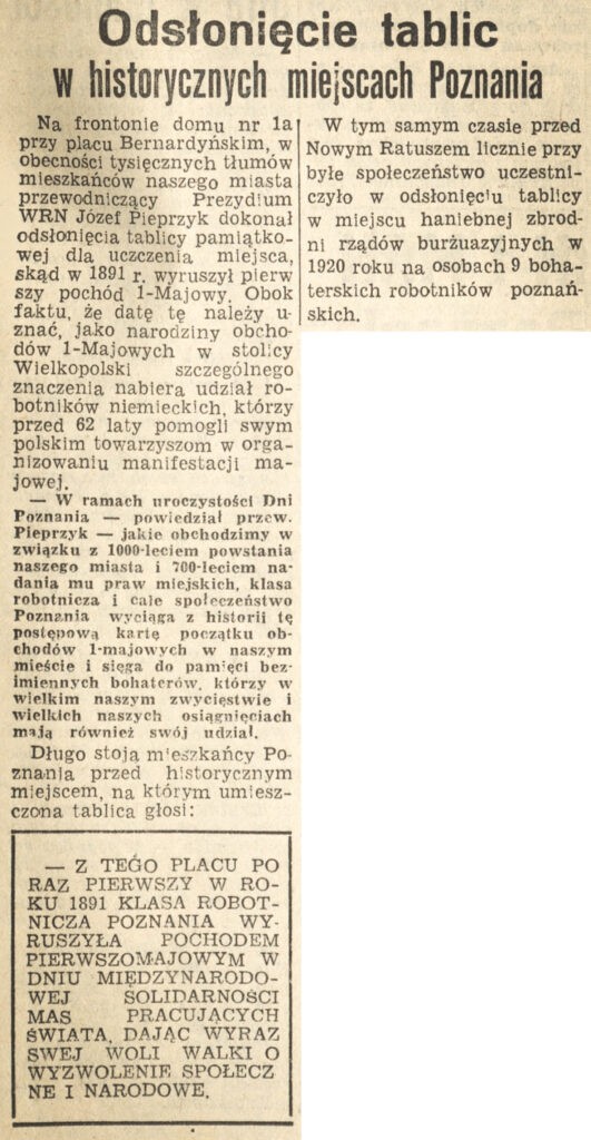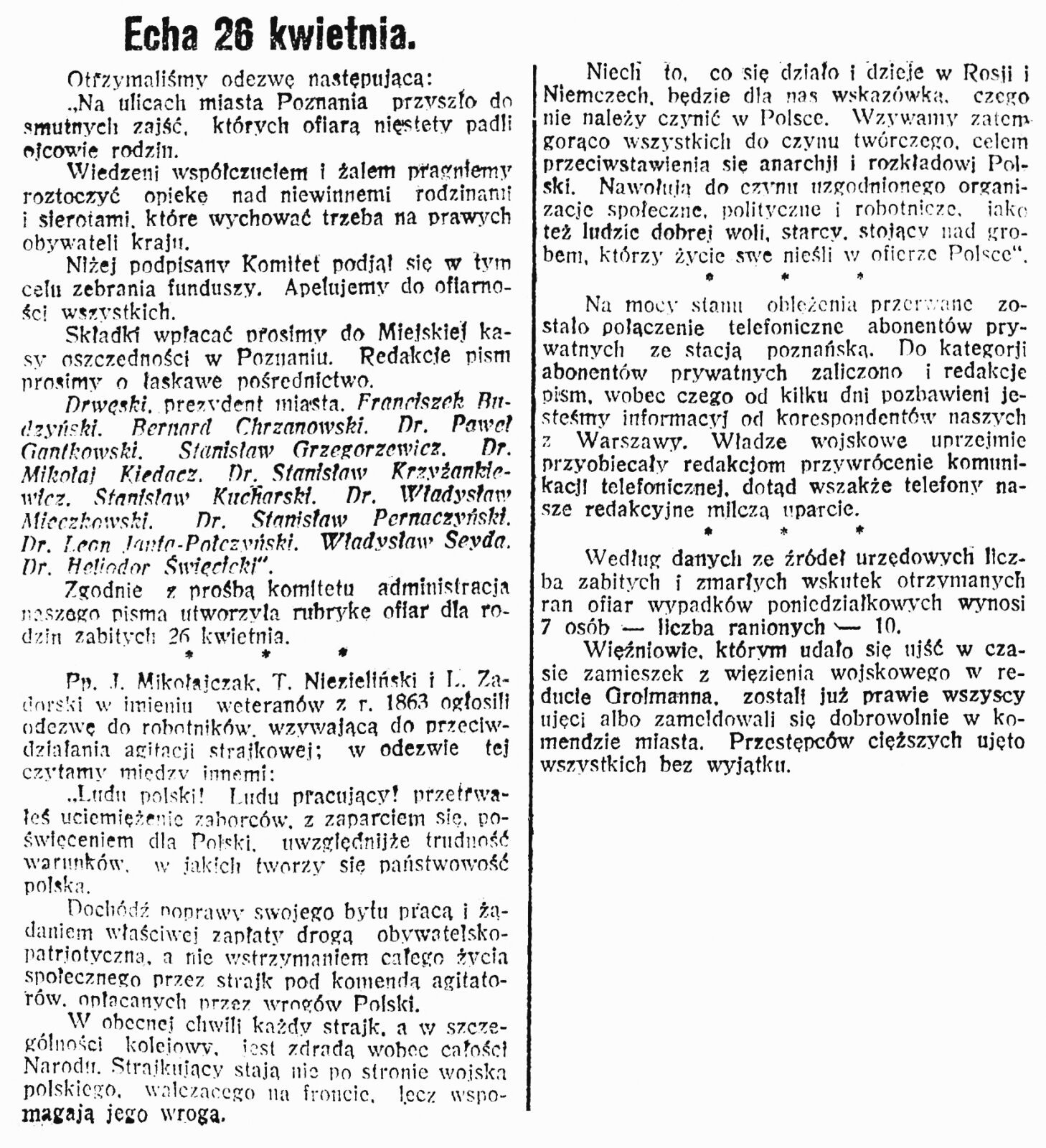 Za pomoc w zebraniu materiałów – w tym w ustaleniu nazwisk robotników zmarłych w skutek odniesionych ran – dziękuję p. Rafałowi Ratajczakowi. Widomym skutkiem tej kooperacji będzie ujednolicenie inskrypcji na nagrobku oraz na tablicy pamiątkowej na elewacji Zamku przez Wydział Kultury Urzędu Miasta Poznania.