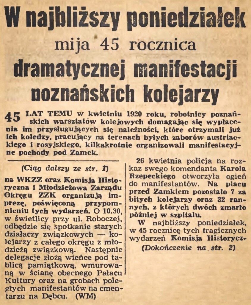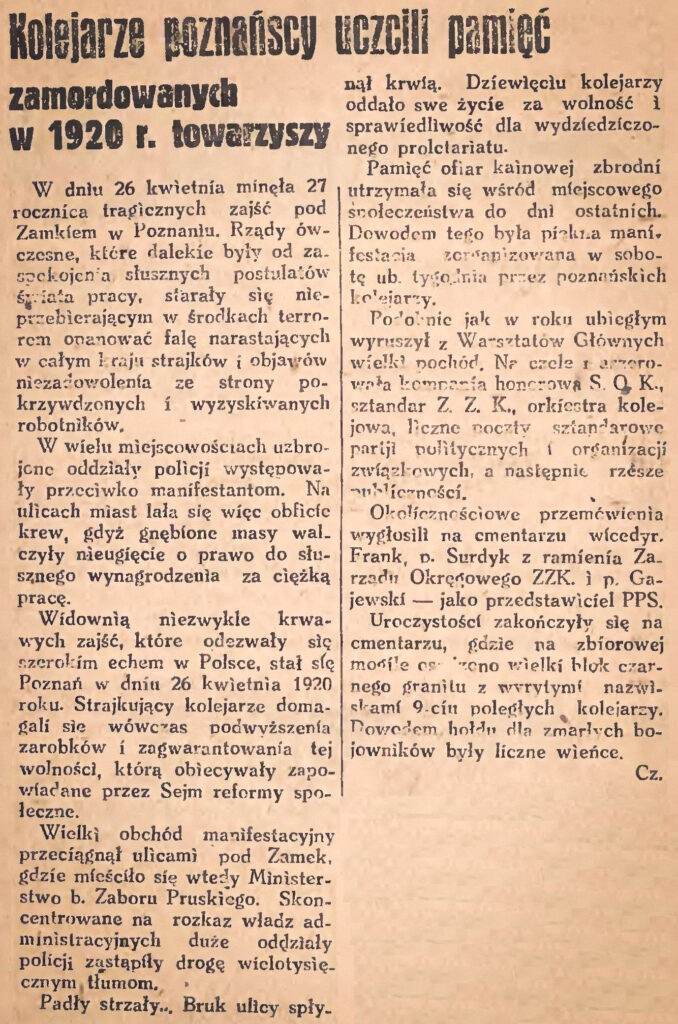 Poniżej zgromadzono materiały dotyczące strajku poznańskich robotników kolejowych, zakończonego krwawymi rozruchami pod Zamkiem Cesarskim dnia 26 kwietnia 1926 r.
