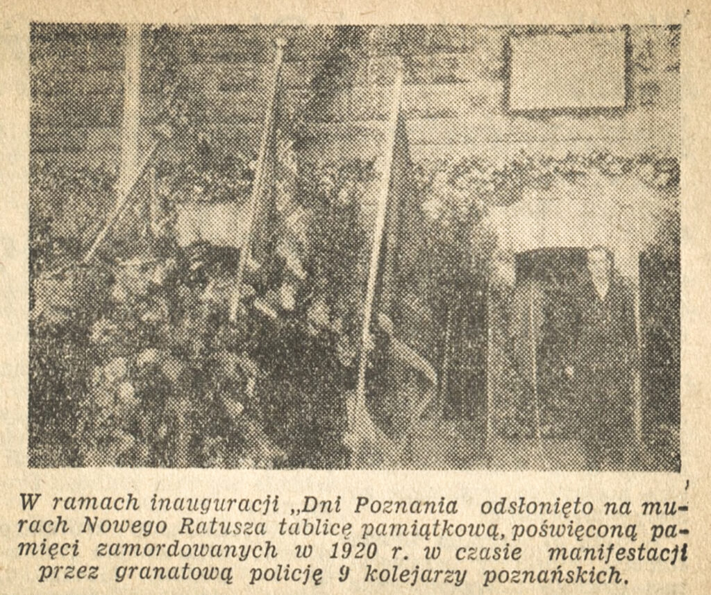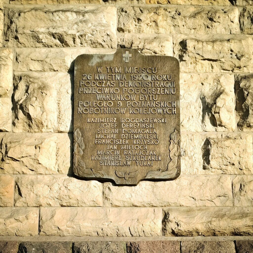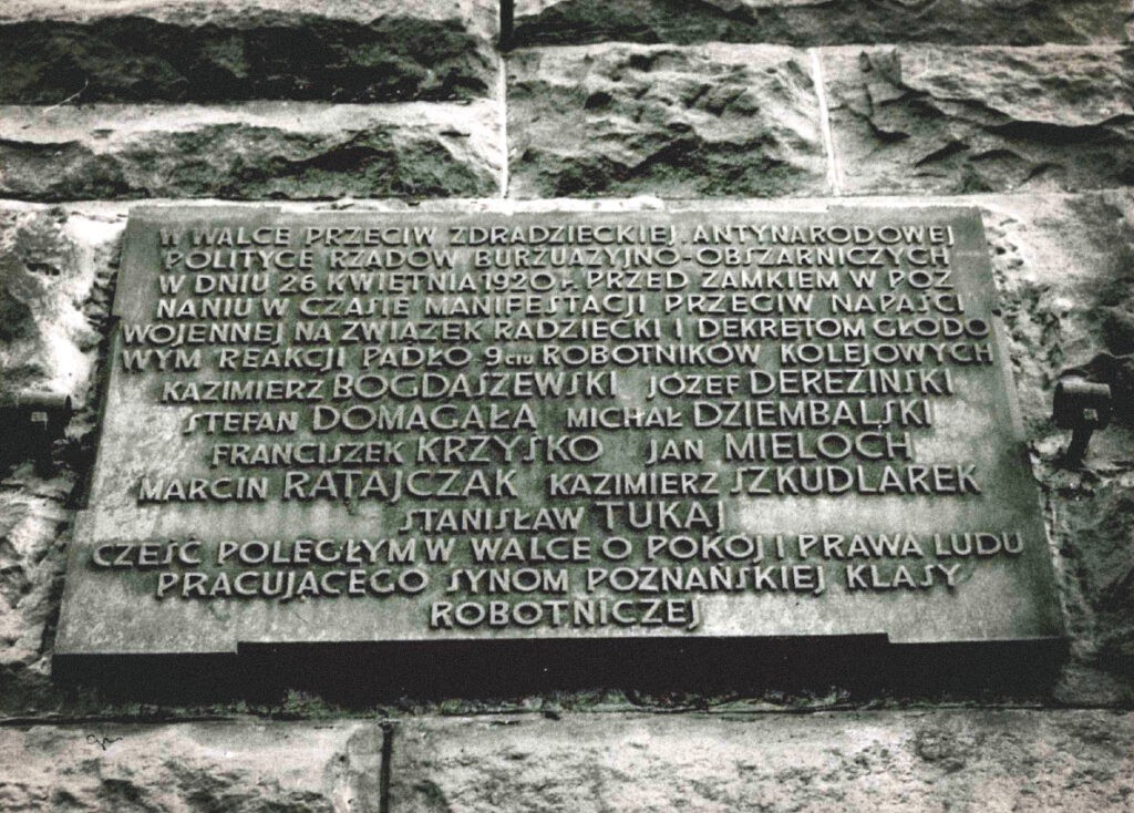 **** Ze składek pozyskanych od robotników ufundowano nagrobek; chciano też sfinansować upamiętnienie pod Zamkiem, w miejscu, gdzie rozegrała się tragedia, jednak ówczesne władze nie wyraziły na to zgody. Ostatecznie tablica pamiątkowa pojawiła się pod koniec lat 20. XX w. na ścianie Domu Kolejarza przy ul. Stromej 24 (ob. Niedziałkowskiego). Uległa zniszczeniu wraz z budynkiem podczas walk o Poznań w 1945 r. Kolejną tablicę, zawierającą inskrypcję o wydźwięku jednoznacznie propagandowym, odsłonięto w 1950 r. na elewacji Zamku. W roku 1992 została wymieniona na nową (istniejącą do dziś), projektu Ryszarda Skupina (por. aktualna fotografia niżej).