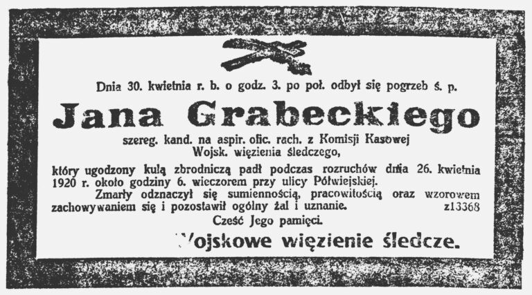 ** szer. Jan Grabecki, ur. w 1896 r. w Pieruszyczkach pod Pleszewem; zginął przy ul. Półwiejskiej, ugodzony kulą (por. nekrolog niżej).