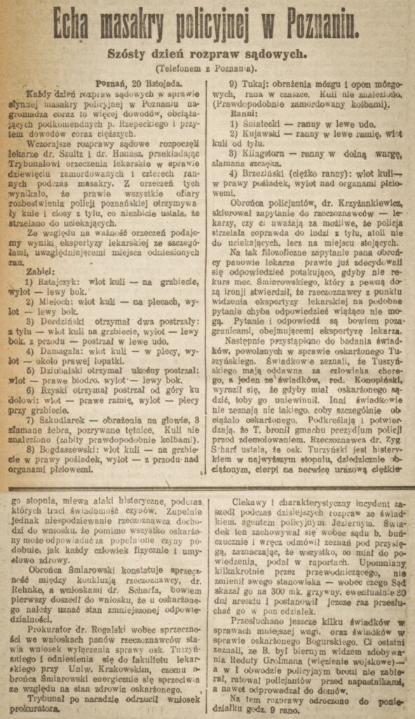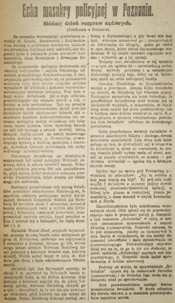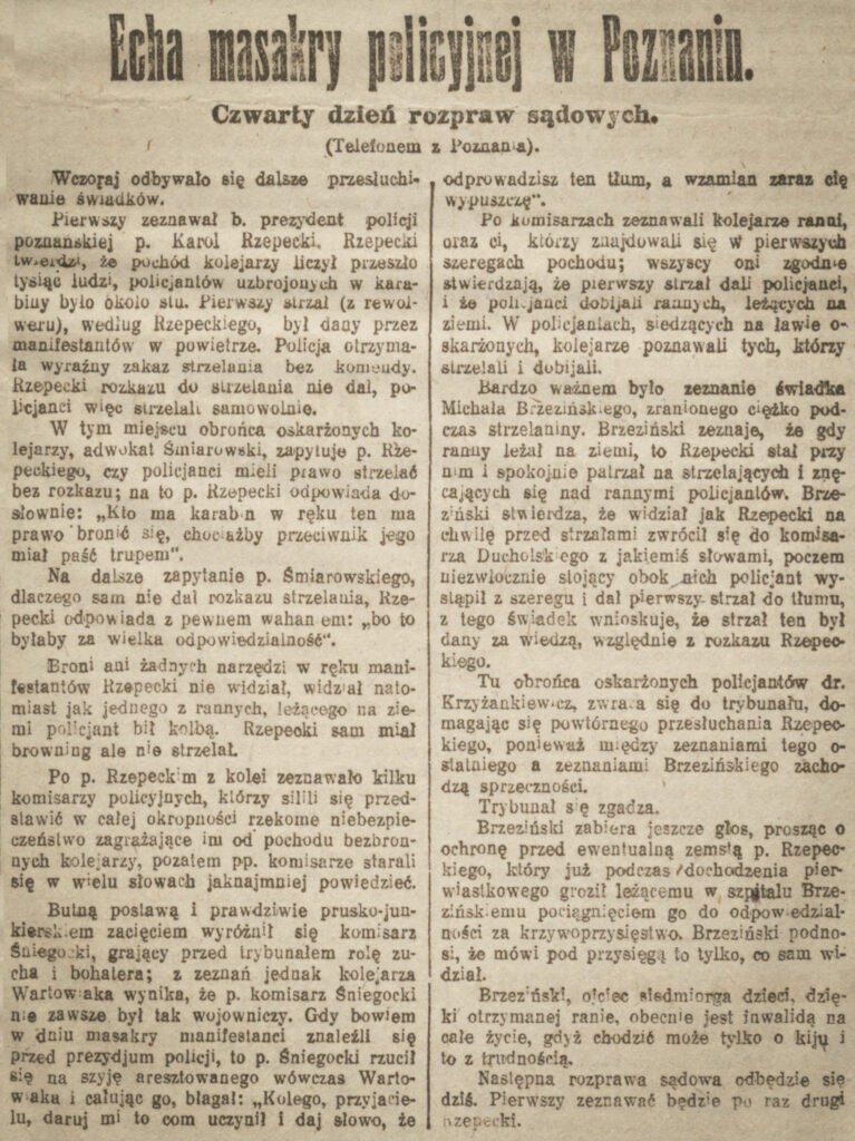 Dotąd nie ustalono, kto wydał rozkaz – minister Seyda, czy komisarz Karol Rzepecki; ze strony otaczającego Zamek policyjnego kordonu padły strzały. Twierdzono później, iż jedynie odpierano atak robotników podjudzanych przez żydowskich związkowców, bolszewickich agitatorów, niemieckich rewolucjonistów czy też zdrajców i „wrogie Polsce żywioły” w ogólności (oczywiście, nie wszystkich naraz! – proweniencja domniemanych wodzirejów strajku zależała od profilu ideowego gazety, w której opisywano „wypadki poznańskie”). Tak, czy inaczej, idee i uprzedzenia przysłoniły faktyczny, jakże oczywisty motyw – chęć natychmiastowej poprawy warunków bytowych poznańskich kolejarzy.