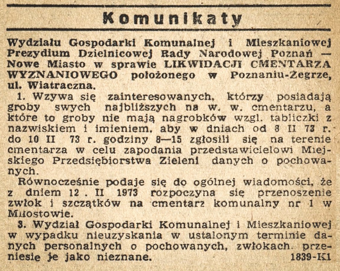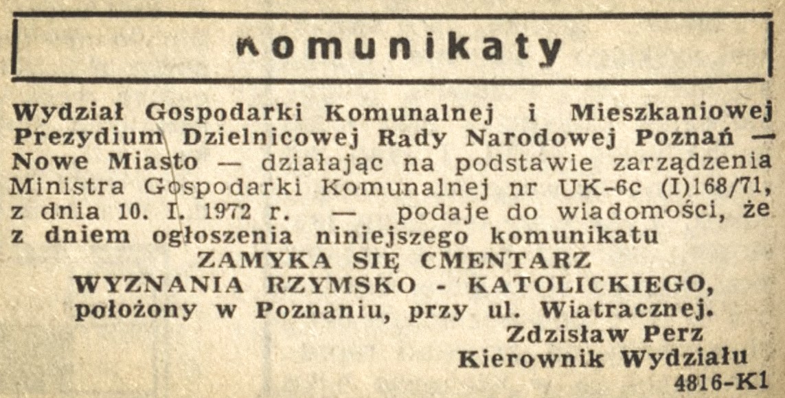 Źródło: Relacja Zenona Śmigielskiego z listopada 2012 r., który jako pracownik firmy budowlanej brał udział w porządkowaniu terenu cmentarza, przywołana w: Ł. Jastrząb, Likwidacje cmentarzy rzymskokatolickich w Poznaniu po 1945 roku, Poznań 2012, s. 31.