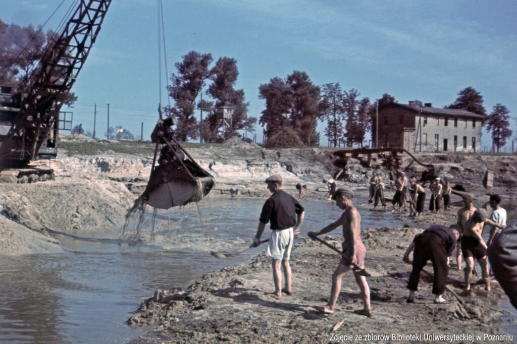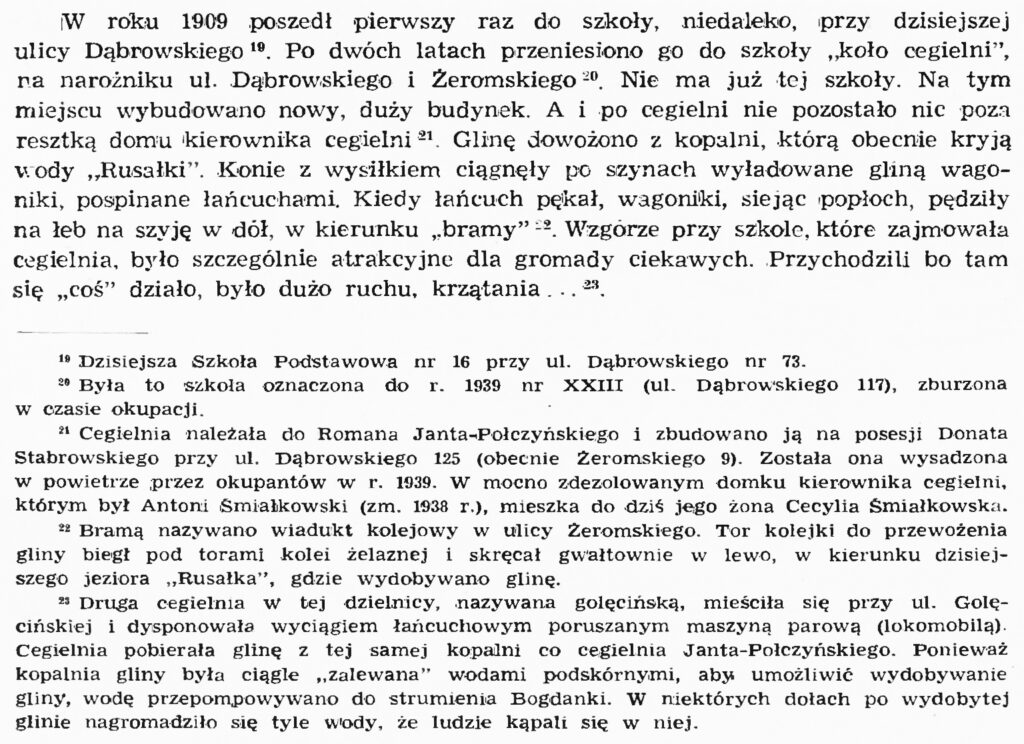 Ja pracę w firmie Foto-Stewner w lecie wykonywałem na dwie zmiany. Często kiedy około 5.00 nad ranem wracałem do domu znajdującego się przy ul. Poznańskiej, w pobliżu mostów kolejowych spotykałem idącą do pracy kolumnę Żydów. Wyglądali okropnie: chudzi, bladzi, ubrani w łachmany, brudni, ledwie się wlekli w ciężkich drewnianych okulakach. Temu pochodowi śmierci towarzyszył ponury stukot obuwia i trzask łyżek i talerzy blaszanych przytroczonych do pasa. Codziennie kilkunastu ginęło przy budowie jeziora Rusałka i tyluż codziennie wieszano na terenie obecnego Stadionu 22 Lipca, gdzie mieli swój obóz. Na ich tle Anglicy, których kolumny pracowały przez pewien czas przy rozbiórce domów przy ul. Poznańskiej, wyglądali jak bogowie.