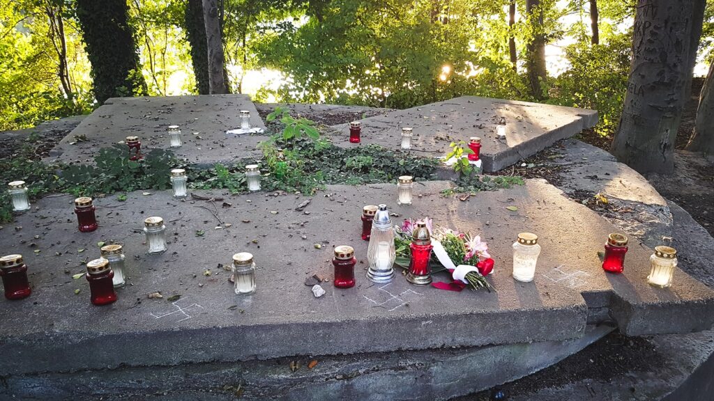 Społeczną pamięć regularnie przywracają fragmenty nagrobków – w tym macew, pozyskanych podczas likwidacji poznańskich kirkutów na początku lat 40. XX w. – odkrywane wokół jeziora, a także ukazujące się spacerowiczom, kiedy poziom wody w nim jest niski. Użyto ich jako budulca mostków ponad ciekami spływającymi do Rusałki*(6), jako wzmocnienie brzegów kanału doprowadzającego wodę do stawów w Parku Sołackim oraz jako materiał służący wzmocnieniu południowo-wschodniego brzegu i dna sztucznego zbiornika*(7). Trudno wszelako określić liczbę takich fragmentów – badania z zakresu archeologii podwodnej*(8), zorganizowane przez Instytut Pamięci Narodowej w 2022 r. sugerują, iż przywoływana w mediach liczba setek czy nawet tysięcy nagrobków może być przeszacowana…